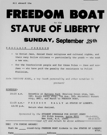 SSSJ rallies frequently focused on Jewish holidays and utilized their traditional meanings and the power of their symbols to infuse meaning into the demonstrations. When Gorbachev visited New York in 1988, SSSJ was there to “greet” him and make sure he understood their message. His visit took place on Hanukkah; SSSJ distributed a handsome flyer at a “Lights for Freedom Rally.”