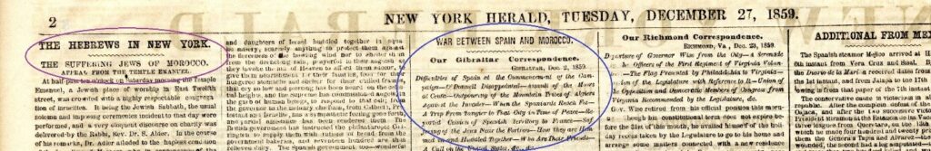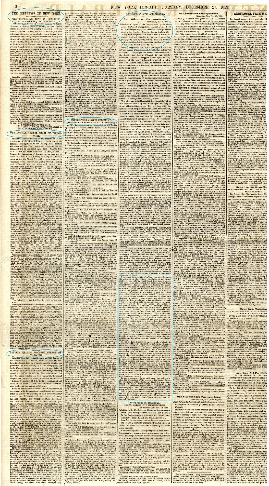 - “The Annual Jewish Feast of Dedication” is a lengthy description of Hanukah, a detailed and thorough explanation of the holiday for those who know nothing about it.  It is interesting to note that the popular name for the holiday, “Hanukah” is not mentioned in the article.  The “Feast of Dedication” is defined as “the annual Jewish festival in commemoration of the purification of the Second Temple.” The festival is marked by burning lamps fed by pure olive oil in the synagogues and private residences; one additional lamp is lit every night for eight nights. When the lamps are lit, “the children … are each supplied with a bunch of tapers, which, of course, they take great delight in lighting, waving, putting out, relighting … while dancing, singing and general festivity reign supreme, just as at one of our New England ‘apple bees.’”  “The lamp used at this festival is peculiar…” – it is made of silver, has a drawer of eight compartments, each containing a wick and olive oil; “to the right of the whole apparatus is an upright rod, bearing a cup, called the sexton. This is also filled with olive oil and is used in relighting or replenishing the other lights.”  The piece continues with the history of the holiday in great detail, including the victory of the Maccabees over Antiochus’ armies and the subsequent cleansing, purification, and rededication of the Temple, including the story of the lone bottle of oil with the seal of the high priest intact, a one-day supply which miraculously lasted for eight days. The anonymous author of this holiday guide refers to an academic source for the information on the holiday, and quotes from it liberally: “The Book of Antiochus, translated from the original Hebrew and Arabic, comprehended in two manuscripts, in the British Museum, and published for the Hebrew Antiquarian Society by H. [Herschell] Filipowski, in 1851, will give a full account of the … origin of the ‘Feast of Dedication.’”The author’s description of The Book of Antiochus is not quite accurate; Filipowski actually translated it from Aramaic – not Arabic -  into Hebrew and English. It was the first translation of the work into English, thus making it available to a wide audience.  Filipowski’s translation of The Book of Antiochus  was published only eight years before the article in the Herald appeared, appended to his translation of Mivhar Ha-Peninim [The Choice of Pearls] a volume which is currently quite rare. It is remarkable that someone in the United States in 1859 would quote from something so esoteric.The two columns comprising “The Hebrews in New York” can be further mined and analyzed for further historical, religious, and sociological information on Jews in New York in 1859.  If these two columns can provide such depth and richness on Jews in New York, just imagine what the entirety of the newspapers in Professor Ron Rubin’s collection can yield!